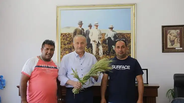 Didim Belediyesi tarafından 74 dönümlük araziye ekilen buğdayların hasat edilmesine sayılı günler kala ilk toplanan başaklar Didim Belediye Başkanı Ahmet Deniz Atabay'a hediye edildi.